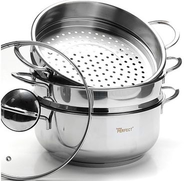 многослойное дно; материал крышки: стекло; материал ручек: сталь; высота ярусов: нижние - 12 см, верхний - 7 см