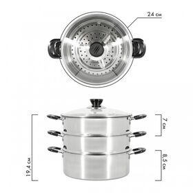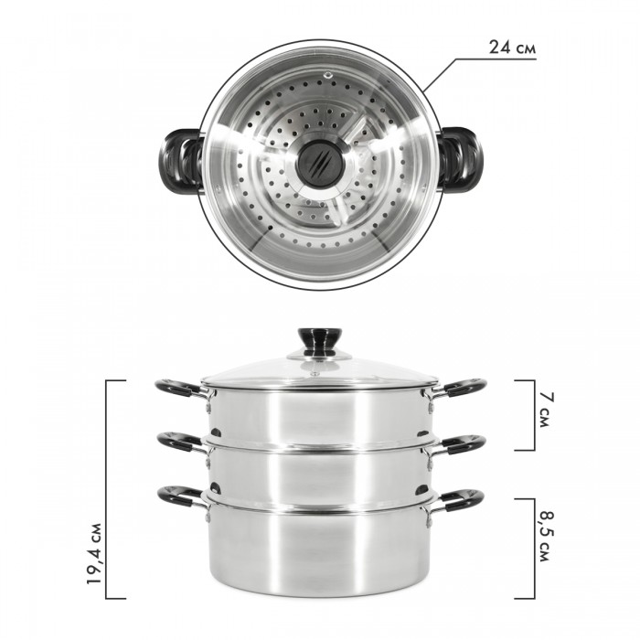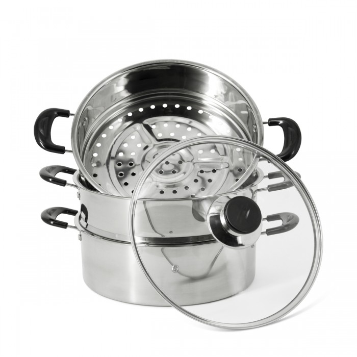 P630100 Vapore Мантоварка-пароварка Pomidoro со стеклянной крышкой. Диаметр 24см. 2 перфорированных яруса, высота 7см. Нижняя часть мантоварки может использоваться как кастрюля, объем 4 литра. Изготовлена из высококачественной нержавеющей стали. Безопасна для человека и не выделяет вредных веществ при повышенных температурах. Крышка изготовлена из термостойкого стекла с отверстием для выпуска пара. Ненагревающиеся бакелитовые ручки.