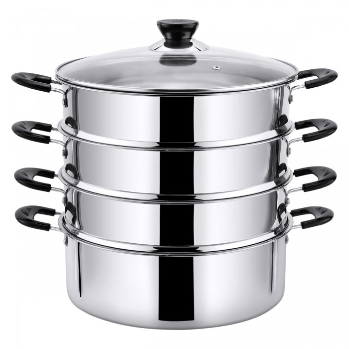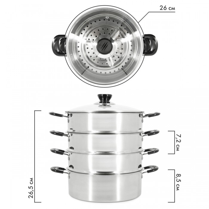 P630102 Vapore Мантоварка-пароварка Pomidoro со стеклянной крышкой. Диаметр 26см. 3 перфорированных яруса, высота 7см. Нижняя часть мантоварки может использоваться как кастрюля, объем 4,7 литра. Изготовлена из высококачественной нержавеющей стали. Безопасна для человека и не выделяет вредных веществ при повышенных температурах. Крышка изготовлена из термостойкого стекла с отверстием для выпуска пара. Ненагревающиеся бакелитовые ручки.