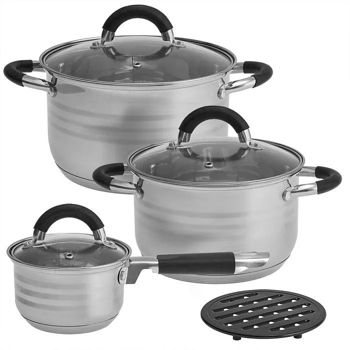Набор кастрюль WEBBER BE-636/6, 6 предметов. Набор посуды из высококачественной нержавеющей стали со стеклянными крышками, с подставкой под горячее. Идеальное приобретение для вашего дома или дачи. Они подойдут для приготовления различных блюд. Стильный дизайн кастрюль, который впишется в любой интерьер кухни дома и на даче.