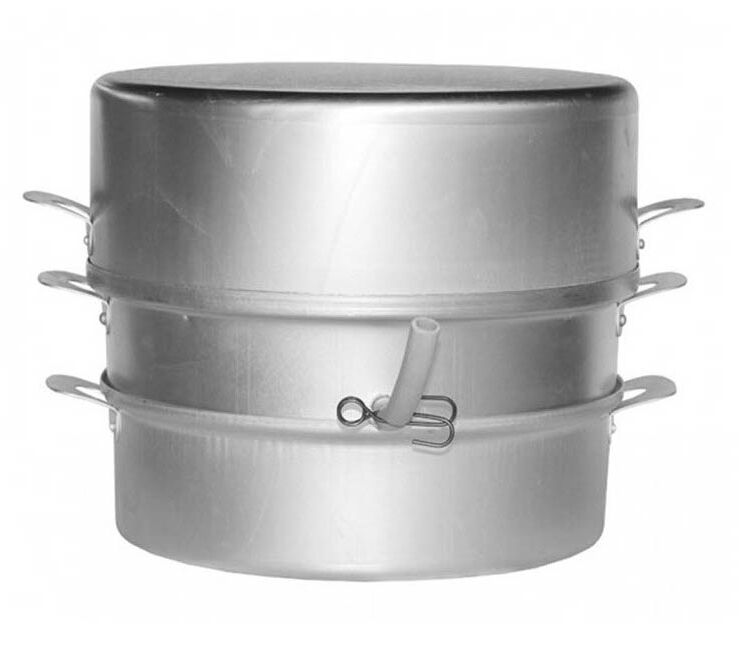 однослойное дно; материал крышки: алюминий; материал ручек: алюминий; в комплект входит поддон для воды, сокосборник, дуршлаг, резиновая отводная трубка, зажим, руководство по использованию и рецептами