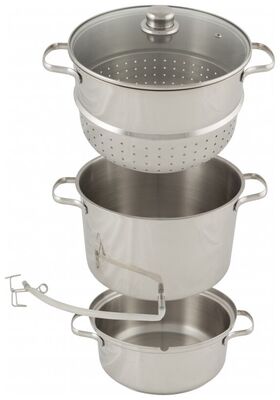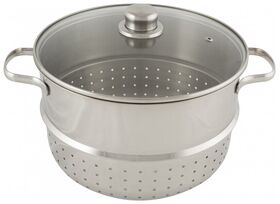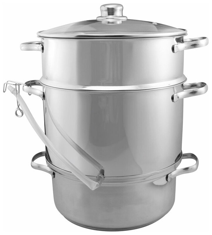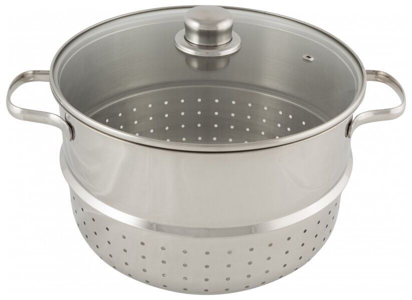 многослойное дно; материал крышки: стекло; материал ручек: сталь; дуршлаг с крышкой - размер: 26*16 см; чаша для сока - размер: 26*16 см; чаша для воды - размер: 24*11 см