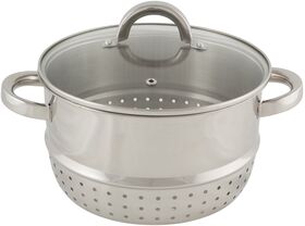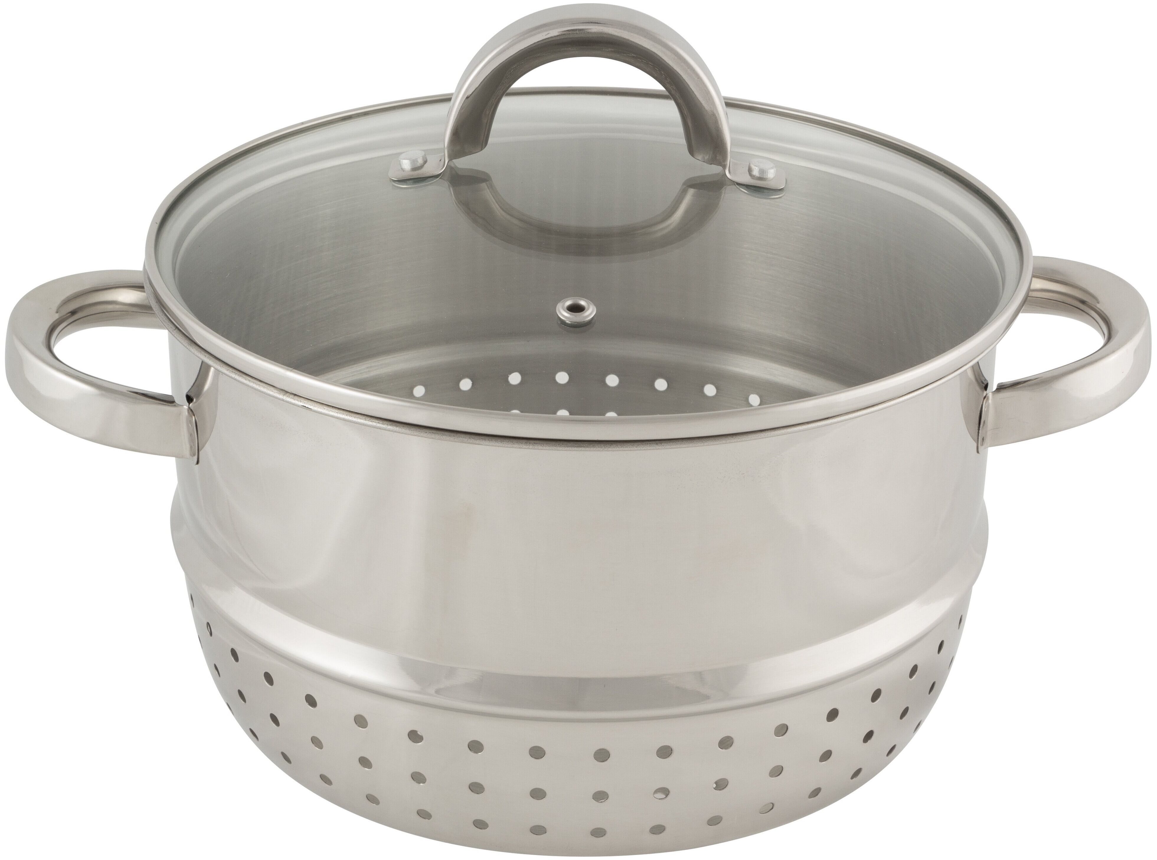 однослойное дно; материал крышки: стекло; материал ручек: сталь; чаша для воды - 20х11 см, чаша для сока - 22х12,5 см, чаша для фруктов/дуршлаг - 22х12,5 см