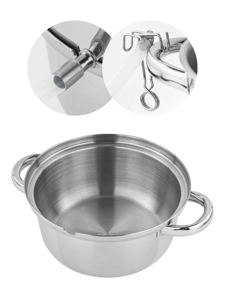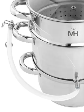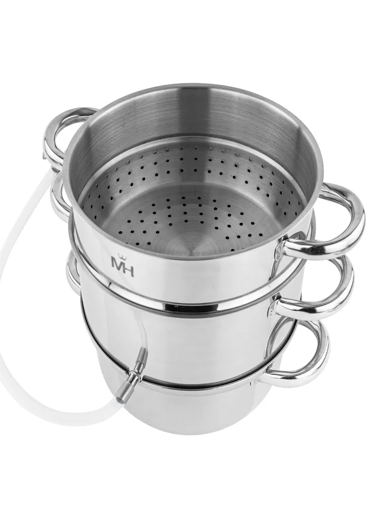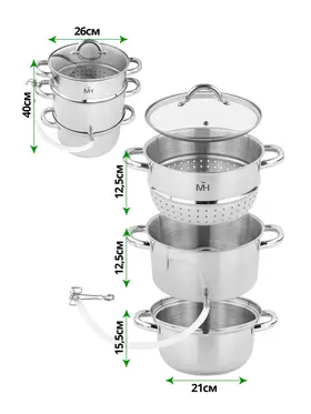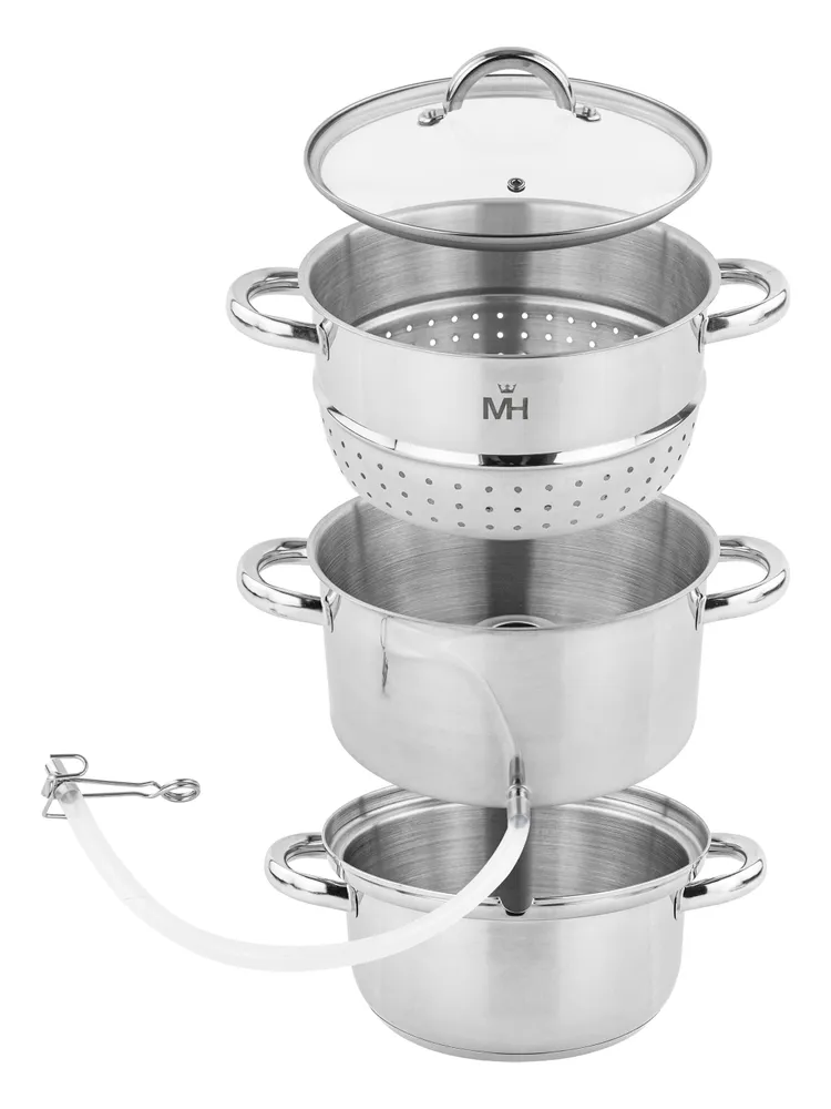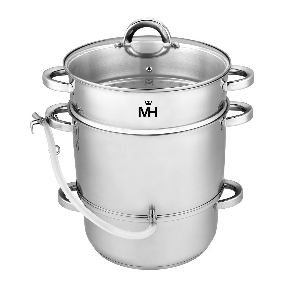 Соковарка с пароотводом. Соковарка с крышкой 26*42 см из высококачественной нержавеющей стали 18/10. Термоаккумулирующее дно. Толщина стенок 0,5 мм, Толщина дна 2,0 мм. Крышка из закаленного стекла. Мерная шкала. Подходит для всех видов плит, включая индукцию.