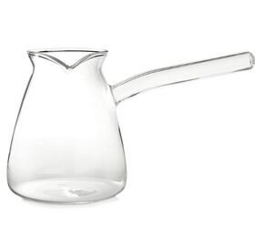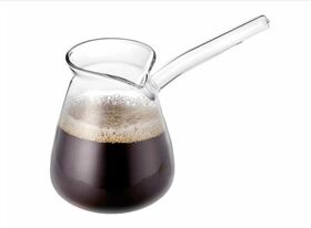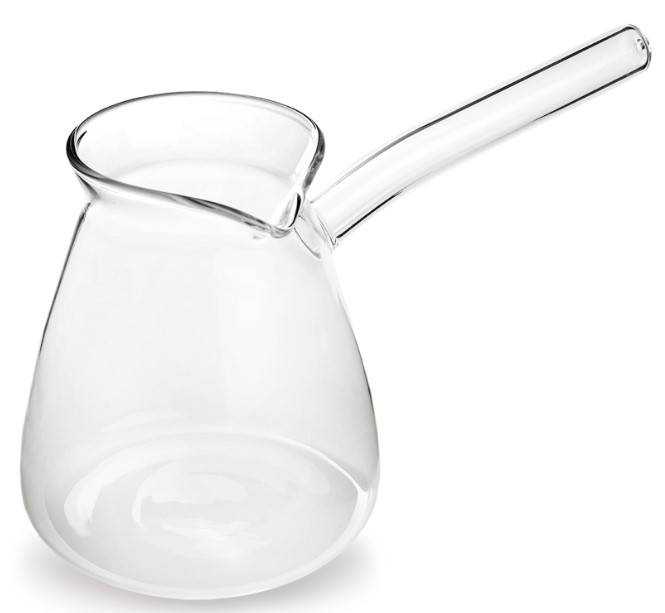 Эта стильная турка позволит вам проследить за процессом заваривания кофе от начала и до конца. Турку можно ставить как на электроплиту, так и на газ. Это возможно благодаря особому составу стекла, из которого сделан корпус. Оно не боится не только нагрева, но и резкого перепада температур: снимая с плиты не бойтесь поставить такую турку на прохладную поверхность. Также турку можно использовать на подставке для подогрева с чайной свечой.
