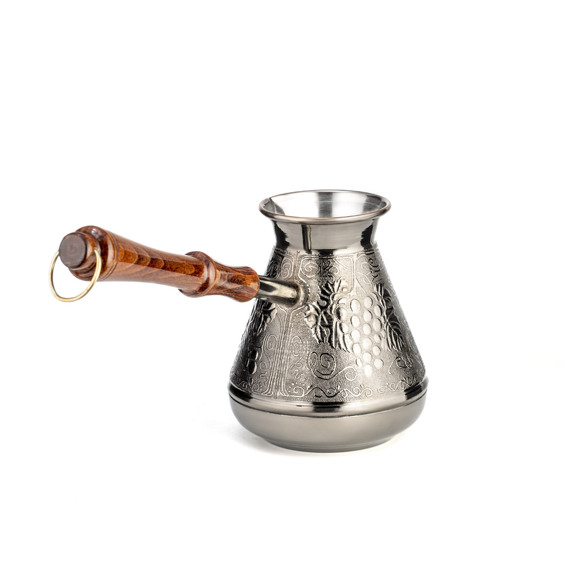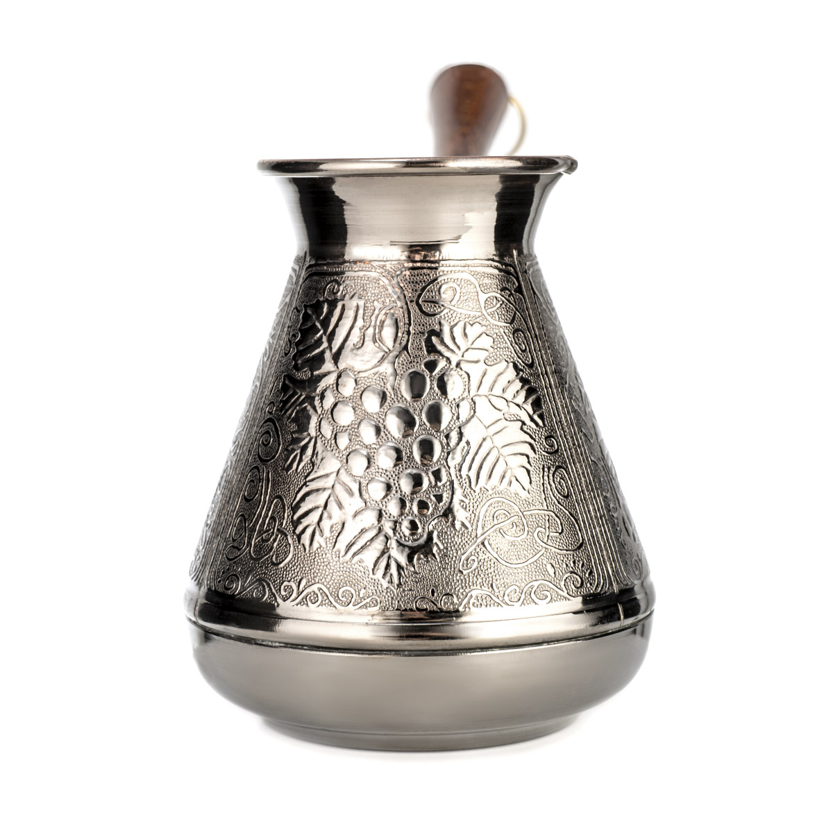 Как приятно выпить чашку свежего только что сваренного кофе. Подлинная находка для любителей настоящего ароматного напитка – турка LARA. Турка латунного цвета выполнена из высококачественной меди в аутентичном дизайне с изящным узором «Виноград». Произведено в России. Удобная лакированная ручка из натурального дерева не будет нагреваться при использовании, а металлическое кольцо позволит подвешивать турку и удобного хранить её. Узкое горлышко способствует наилучшему раскрытию вкуса. Подходит для приготовления натурального кофе на газовых и электрических плитах. Турка дополнит кухонный интерьер и подарит новый опыт в приготовлении кофе.