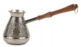 Медная турка классической конусообразной формы с утолщённым дном предназначена для приготовления ароматного натурального кофе. Внутренняя поверхность покрыта пищевым оловом. Наружная сторона украшена оригинальным орнаментом.
