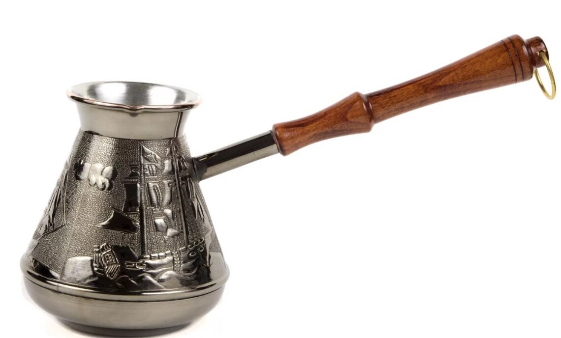 Медная турка классической конусообразной формы с утолщённым дном предназначена для приготовления ароматного натурального кофе. Внутренняя поверхность покрыта пищевым оловом. Наружная сторона украшена оригинальным орнаментом.