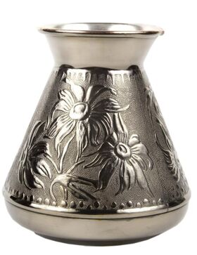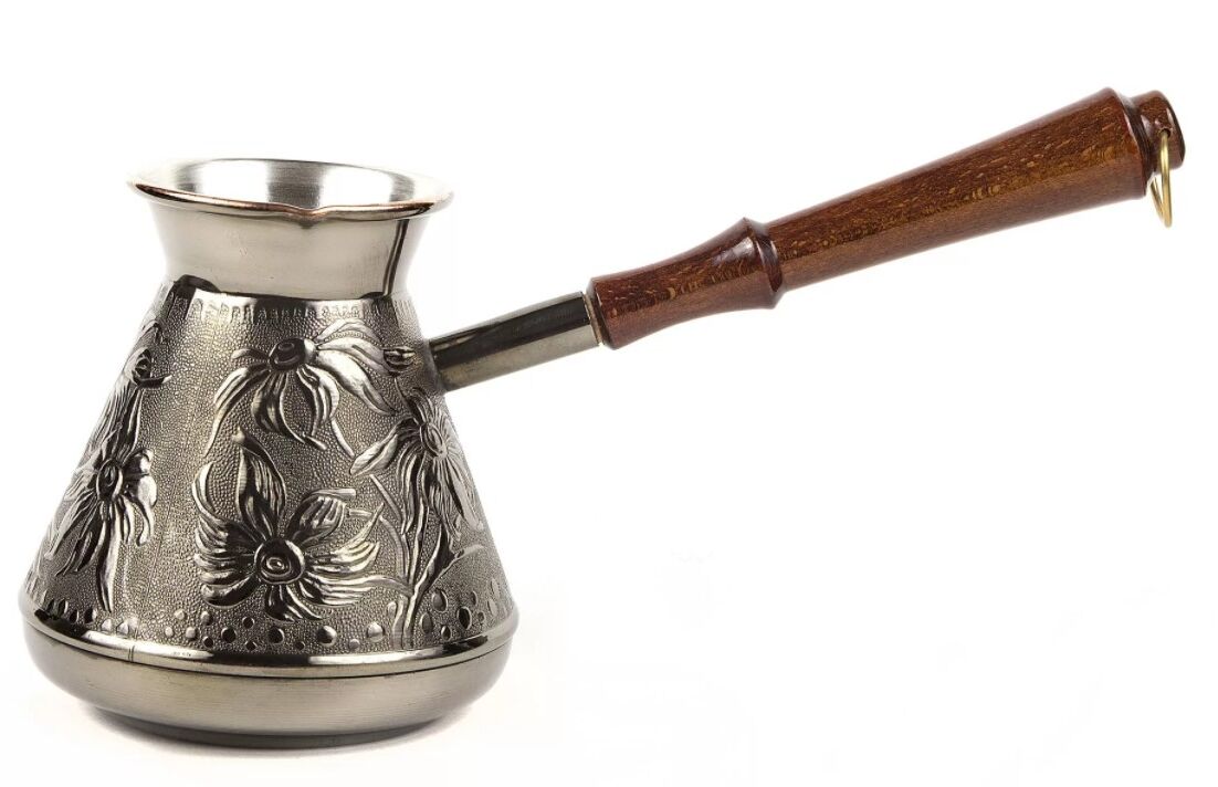 Медная турка классической конусообразной формы с утолщённым дном предназначена для приготовления ароматного натурального кофе. Внутренняя поверхность покрыта пищевым оловом. Наружная сторона украшена оригинальным орнаментом.