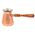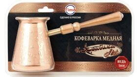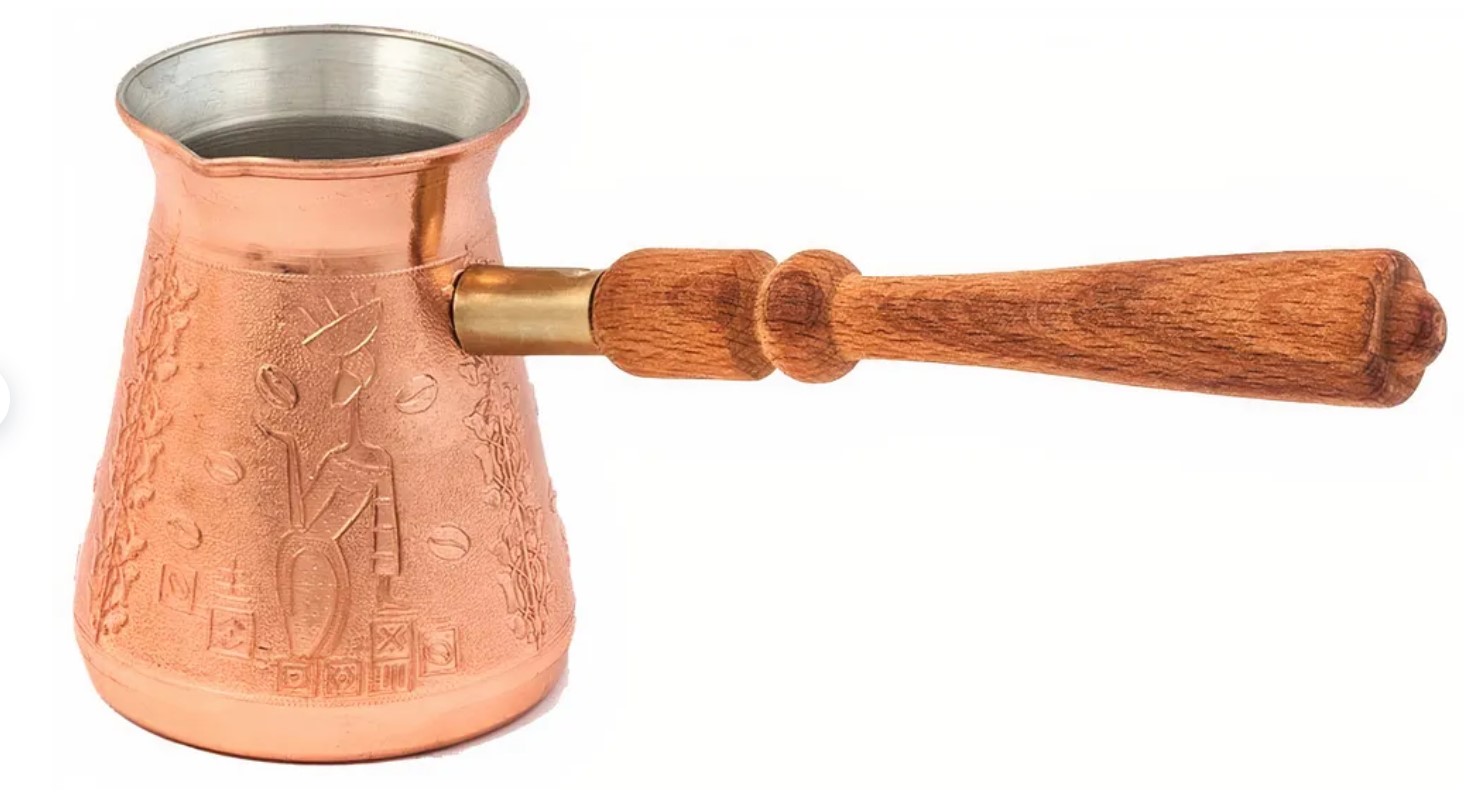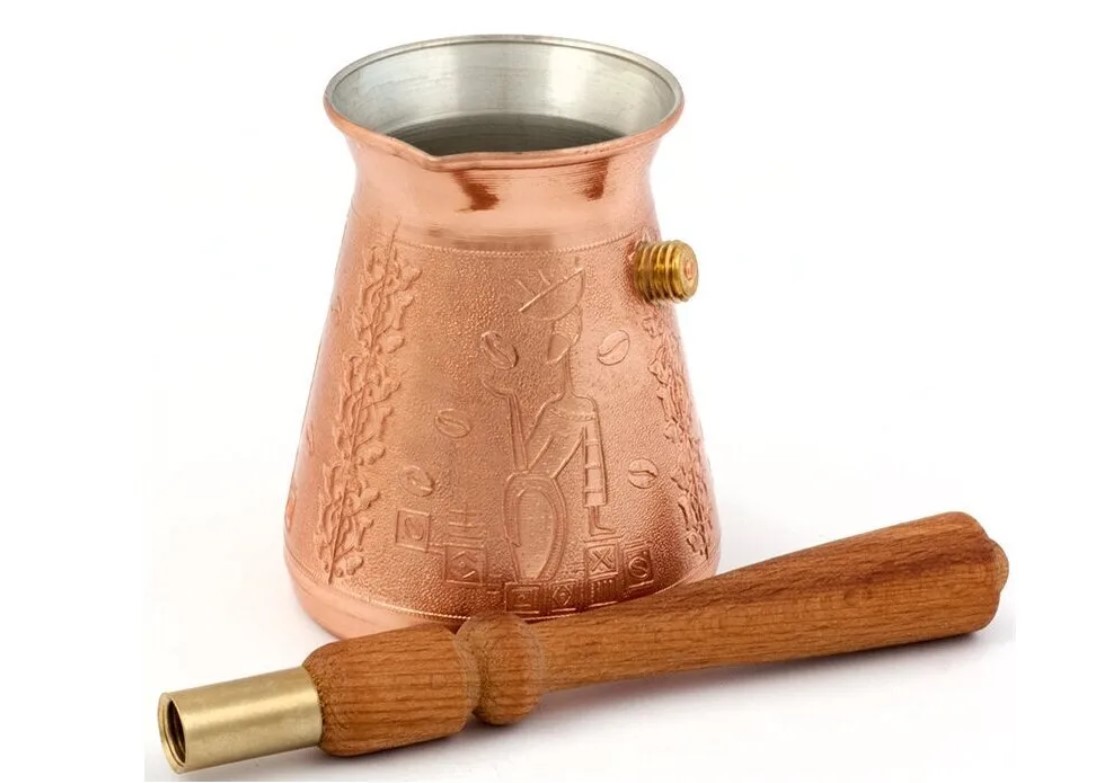 Медь, по утверждению ученых, самый подходящий для приготовления пищи металл на планете Земля, но окись меди вредна для здоровья человека. Поэтому внутренняя поверхность кофеварки покрыта пищевым оловом толщиной 9-12 мкм. Внешняя поверхность кофеварки имеет натуральный цвет и блеск меди и защищена слоем жаропрочного лака. Кофеварка оснащена удобным носиком и деревянной съемной ручкой (ручка прикручивается против часовой стрелки). Подходит для газовых, электрических, стеклокерамических плит. Не рекомендуется мыть в посудомоечной машине. Объем до сужения горлышка - 390 мл, длина ручки - 16 см, диаметр дна - 8 см, диаметр по верхнему краю - 6,5 см, высота стенки - 10,5 см.