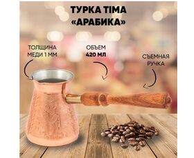 Кофеварка ТimА "Арабика" изготовлена по уникальной технологии из листовой меди марки М1М. Корпус кофеварки "Арабика" являются цельным и выполнен из меди толщиной 1,0 мм.