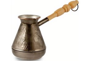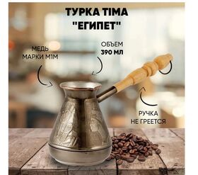 Кофеварка TimA "Египет" изготовлена из высококачественной меди марки М1М, внешняя поверхность имеет декоративное теснение, что придает изделию оригинальный внешний вид, внутренняя поверхность покрыта слоем пищевого олова, являющимся безопасным для здоровья. Медь обладает равномерной теплопроводностью, что позволяет приготовить кофе, отличающийся изысканным ароматом. Узкое горлышко также является положительной характеристикой изделия. Кофеварка оснащена небольшим носиком и удобной не нагревающейся деревянной ручкой с кольцом для подвешивания. Надежное крепление ручки гарантирует безопасное использование.