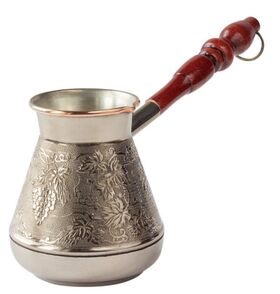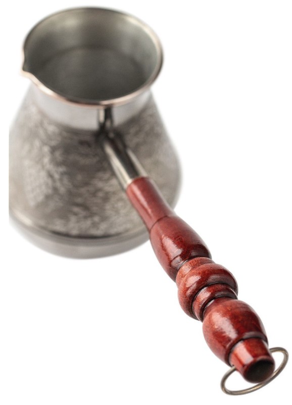 Турка изготовлена из экологически чистой и высококачественной меди марки М1М. Внутренняя поверхность кофеварки покрыта двойным слоем пищевого олова. Олово нужно для защиты пищи и турки от реакций окисления. Снаружи турка покрыта жаростойким лаком. Подходит для стеклокерамических, газовых и электрических плит. При приготовлении напитка диаметр конфорки должен соответствовать или быть чуть меньше диаметра дна турки, чтобы языки пламени не попадали на стенки корпуса посуды, а нагревали только дно. Объем до сужения горлышка - 380мл, вес - 202г, длина ручки - 16,5см, диаметр дна - 7см, диаметр по верхнему краю - 6,5см, высота стенки - 10,5см.