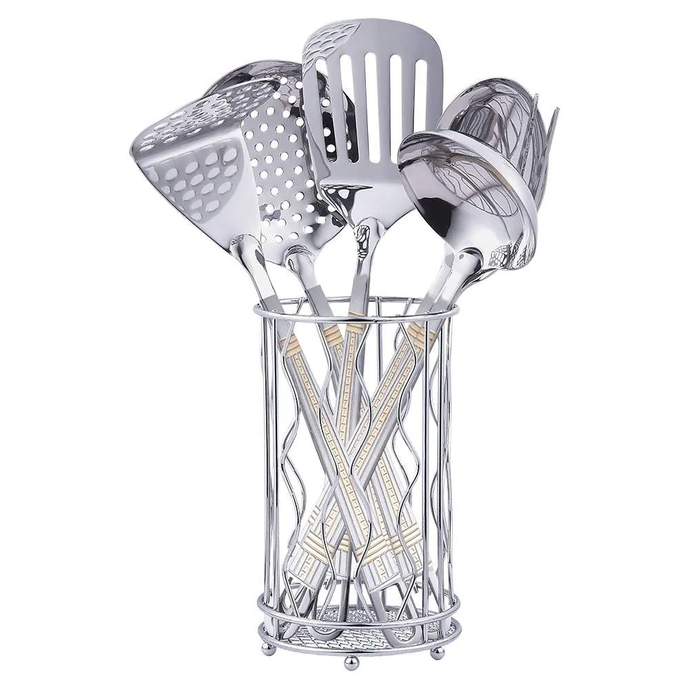 Кухонный набор 7пр. НЕРЖАВЕЮЩАЯ СТАЛЬ, металлическая подставка-туба, комбинированная полировка с рисунком «под золото» (лопатка с прорезями, шумовка, половник, картофелемялка, поварская ложка, поварская вилка ). Подарочная упаковка с пластиковой ручкой.