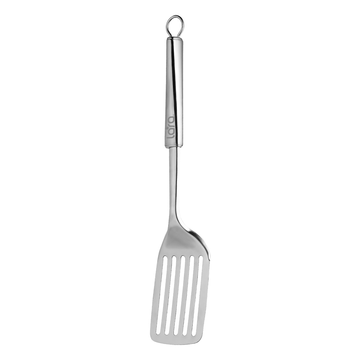 Рабочая часть лопатки изготовлена из стали с высоким содержанием хрома. Кроме характерного блеска хром способствует повышенной коррозионной стойкости. Металлическая рукоятка надежно фиксирует рабочую часть, чтобы она не выскакивала. Есть крючок для подвешивания.