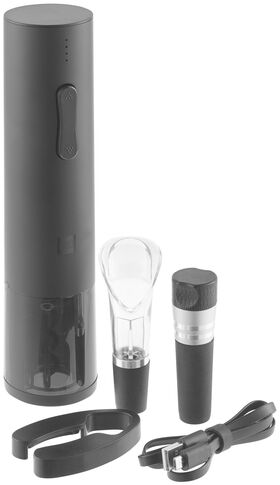 в комплекте: электрический штопор, нож для распечатки, аэратор, вакуумная пробка, кабель USB-Micro USB; светодиодная подсветка (синего цвета при закручивании штопора, красная при изъятии пробки); четырехуровневый индикатор заряда