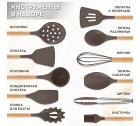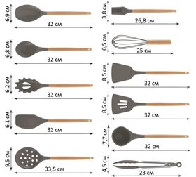 Набор кухонных принадлежностей - идеальный подарок на любой праздник. В набор входит 11 предметов из пищевого силикона с деревянными ручками, а также подставка из пластика. В набор входят самые необходимые аксессуары для кухни: удобная лопатка для жарки, шпатель, венчик, щипцы, плоская ложка для выпечки, лопатка с отверстиями для слива масла, половник, ложка для салата, кисточка для масла, ложка для спагетти и шумовка. Любая домохозяйка мечтает иметь такой набор на своей кухне. Это прекрасный подарок для мамы, любимой, бабушке, подруги на день рождения!
