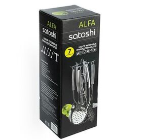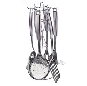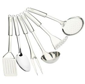 Набор кухонных принадлежностей из нержавеющей стали. Состоит из семи принадлежностей, выполненных в одинаковом дизайнерском решении. Приборы выполнены из нержавеющей стали, можно использовать их для посуды с антипригарным покрытием. Ручки приборов снабжены отверстиями для подвешивания.