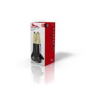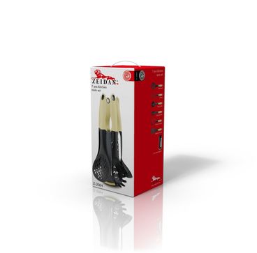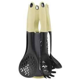 Комплектация подставка-терка, лопатка с прорезями, шумовка, половник, картофелемялка, ложка для спаггети, венчик для взбивания