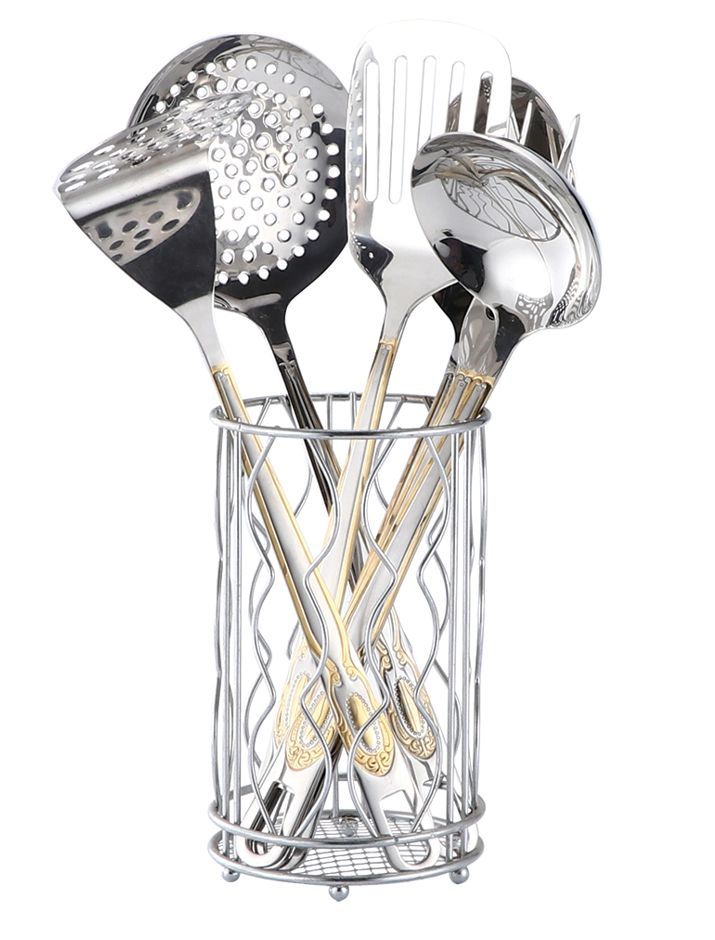 НЕРЖАВЕЮЩАЯ СТАЛЬ, металлическая подставка-туба, комбинированная полировка с рисунком «под золото» (лопатка с прорезями, шумовка, половник, картофелемялка, поварская ложка, поварская вилка).