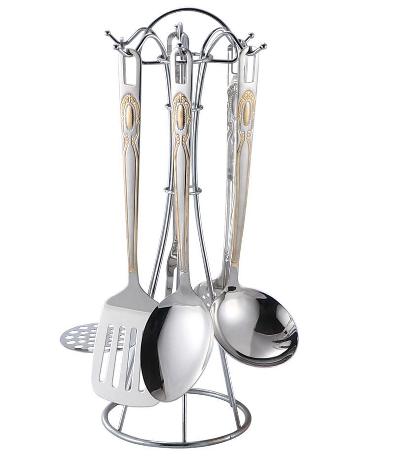 НЕРЖАВЕЮЩАЯ СТАЛЬ, металлическая подставка, комбинированная полировка с рисунком «под золото» (лопатка с прорезями, шумовка, половник, картофелемялка, поварская ложка, поварская вилка).