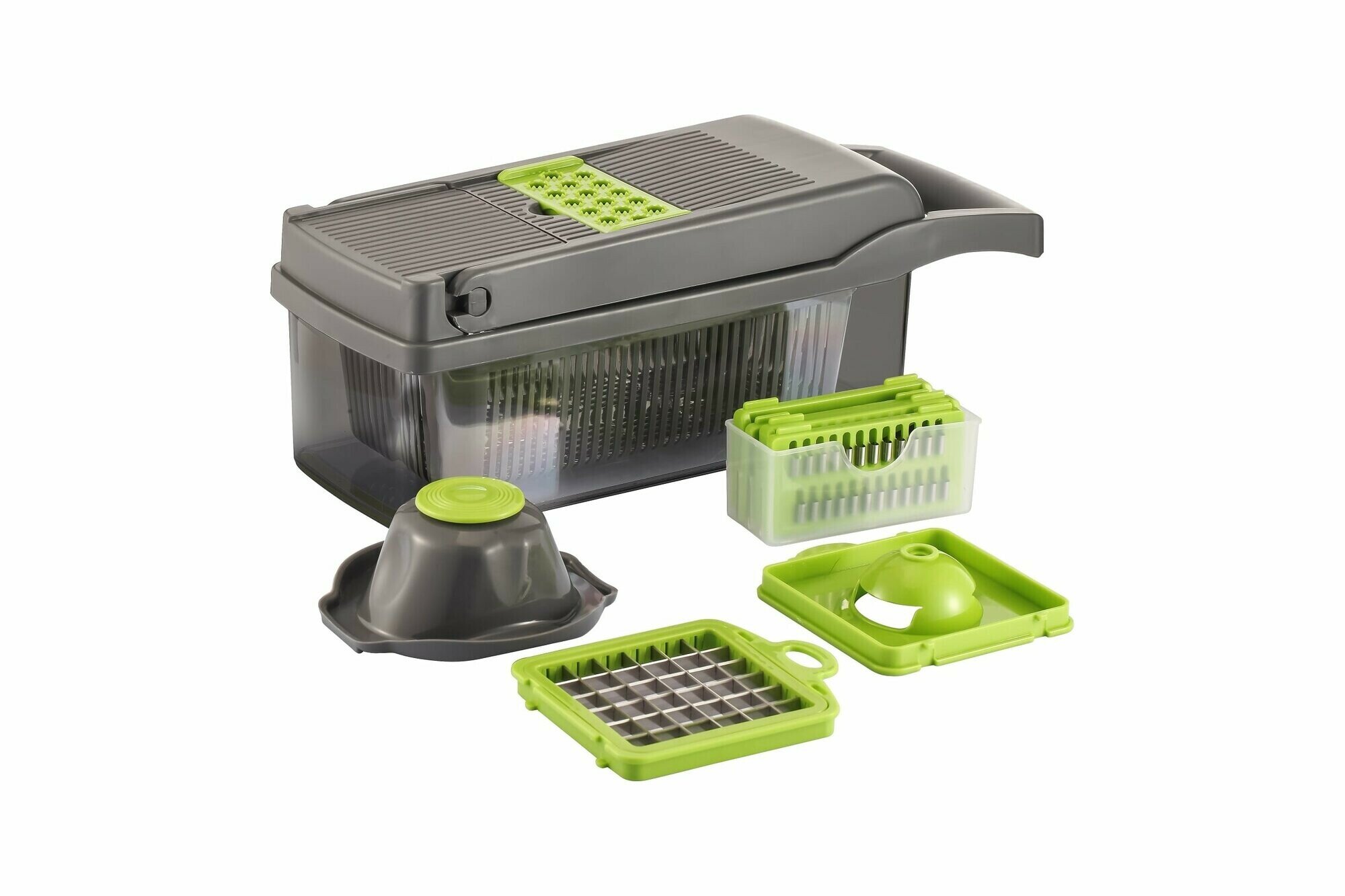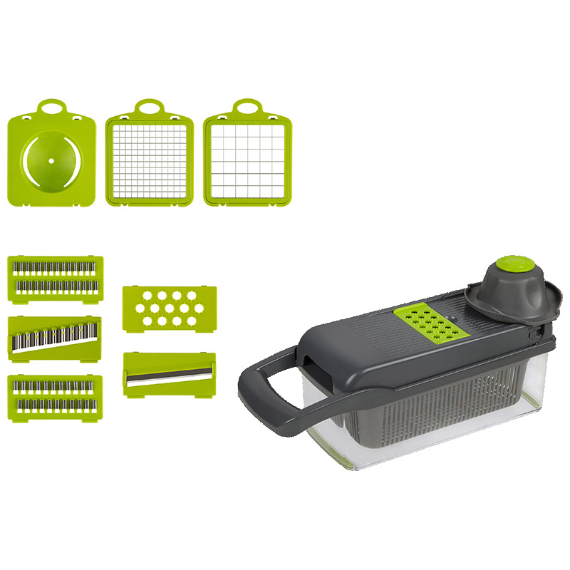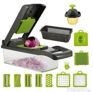 Многофункциональная ручная кухонная овощерезка с контейнером и набором лезвий поможет быстро и легко нарезать овощи для любого салата, красиво сервировать овощную или фруктовую тарелку, приготовить суп или второе блюдо.