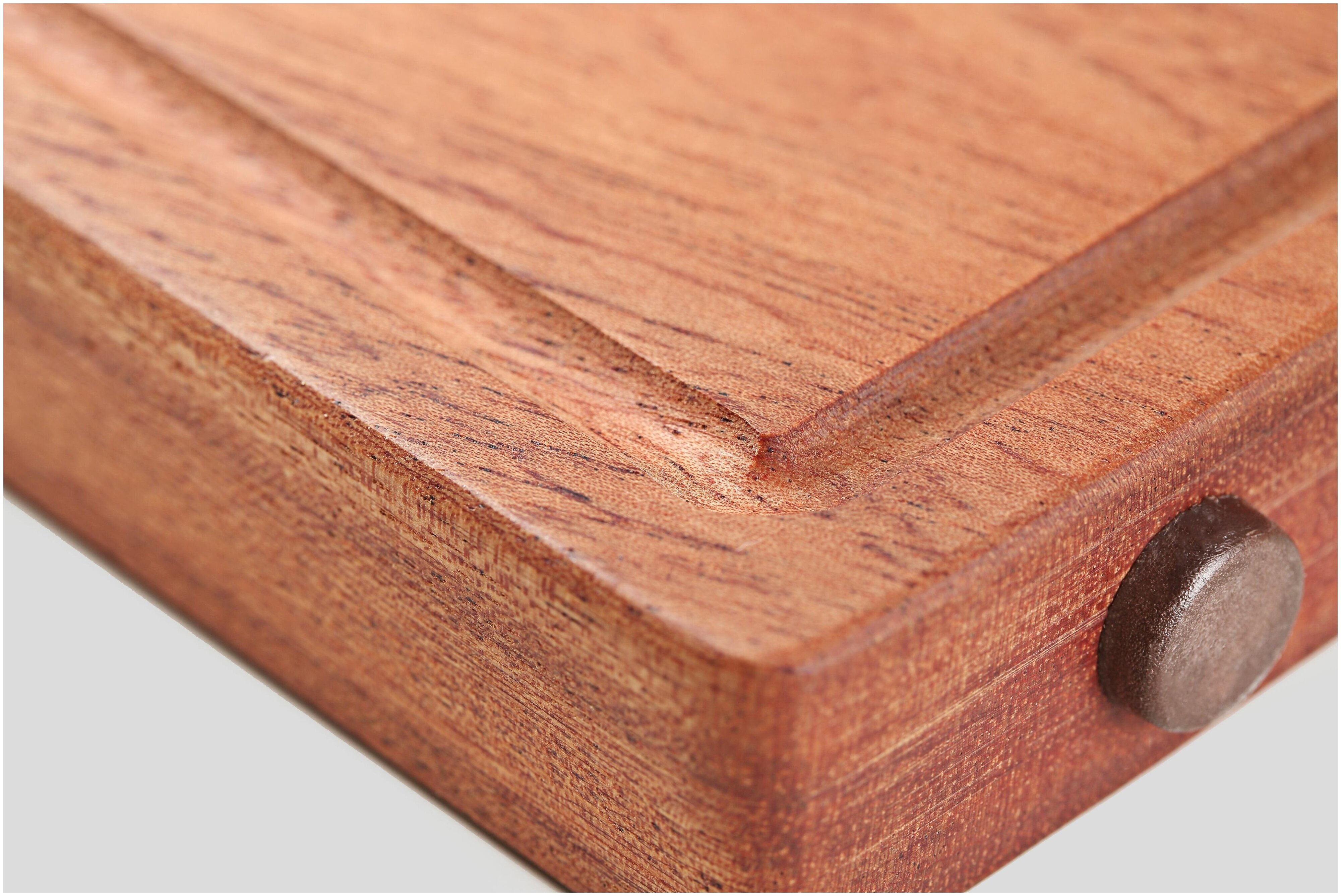 Выбранный материал (древесина сапелли) идеально подходит для разделочной доски, он прочный и надежный, сделан из цельного куска дерева, причем из каждого ствола можно изготовить лишь две разделочных доски, что делает задачу по производству оной еще более ответственной. Обе стороны доски годятся для использования, с одной из сторон есть канавка. Доска лишена трещин и зазоров, в которые могла бы попасть грязь. Соответственно, ее легко мыть, и она безопасна для здоровья. Для долговечности доска покрыта органическим защитным маслом, дабы грязь не могла попасть в поры, присутствующие в любой древесине.