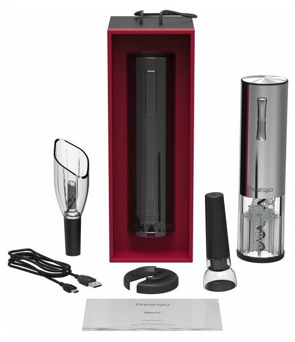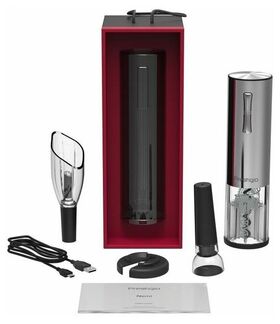 в комплекте: электрический штопор, аэратор, вакуумная пробка пресервер, нож для срезания фольги, USB-кабель