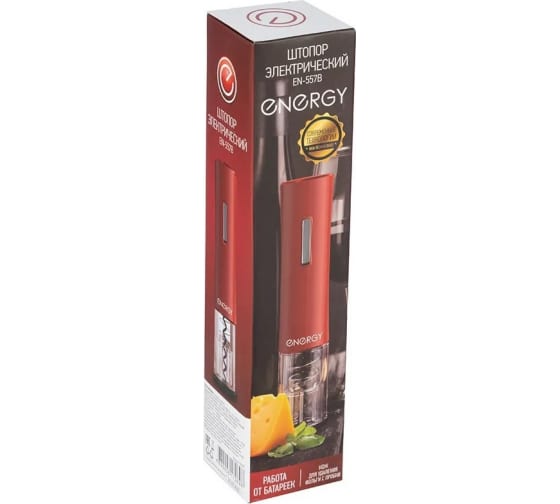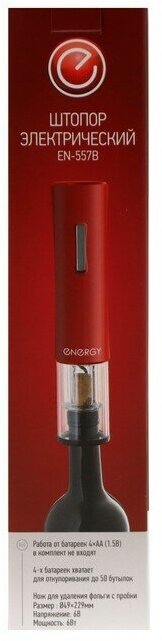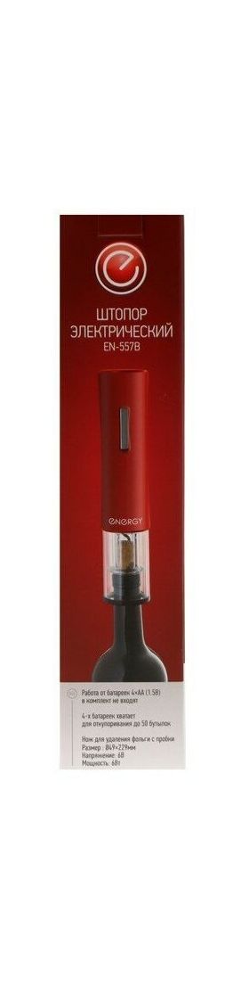 Электрический штопор Energy EN-557B 103597 работает от 4 батареек AA (в комплект не входят). 4-х батареек хватает для откупоривания до 50 бутылок.