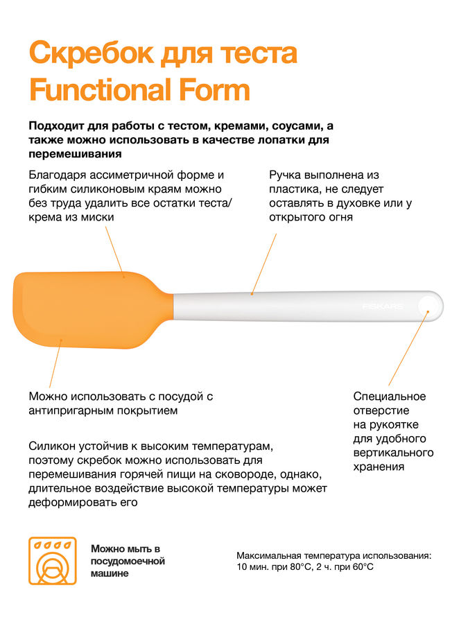 Подходит для работы с тестом, кремами, соусами, а также можно использовать в качестве лопатки для перемешивания. Благодаря ассиметричной форме и гибким силиконовым краям можно без труда удалить все остатки теста/крема из миски. Можно использовать с посудой с антипригарным покрытием.