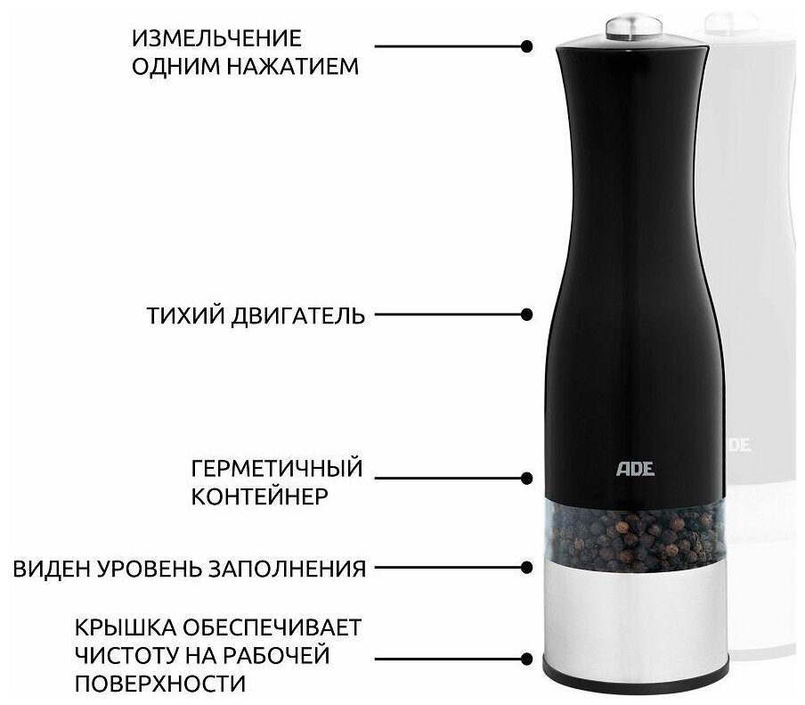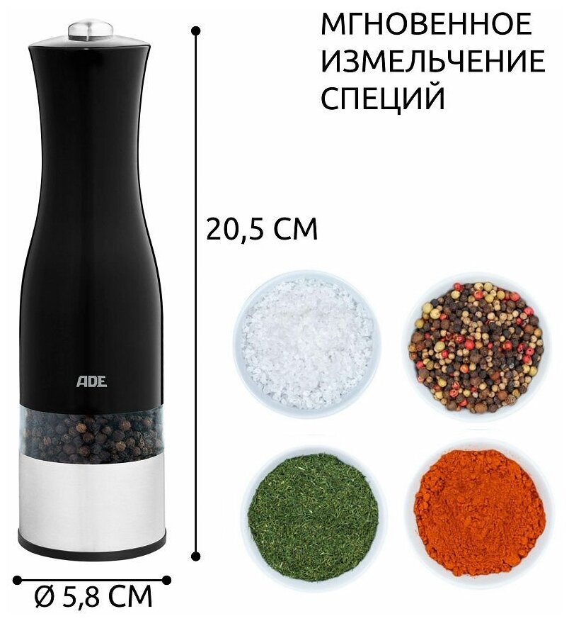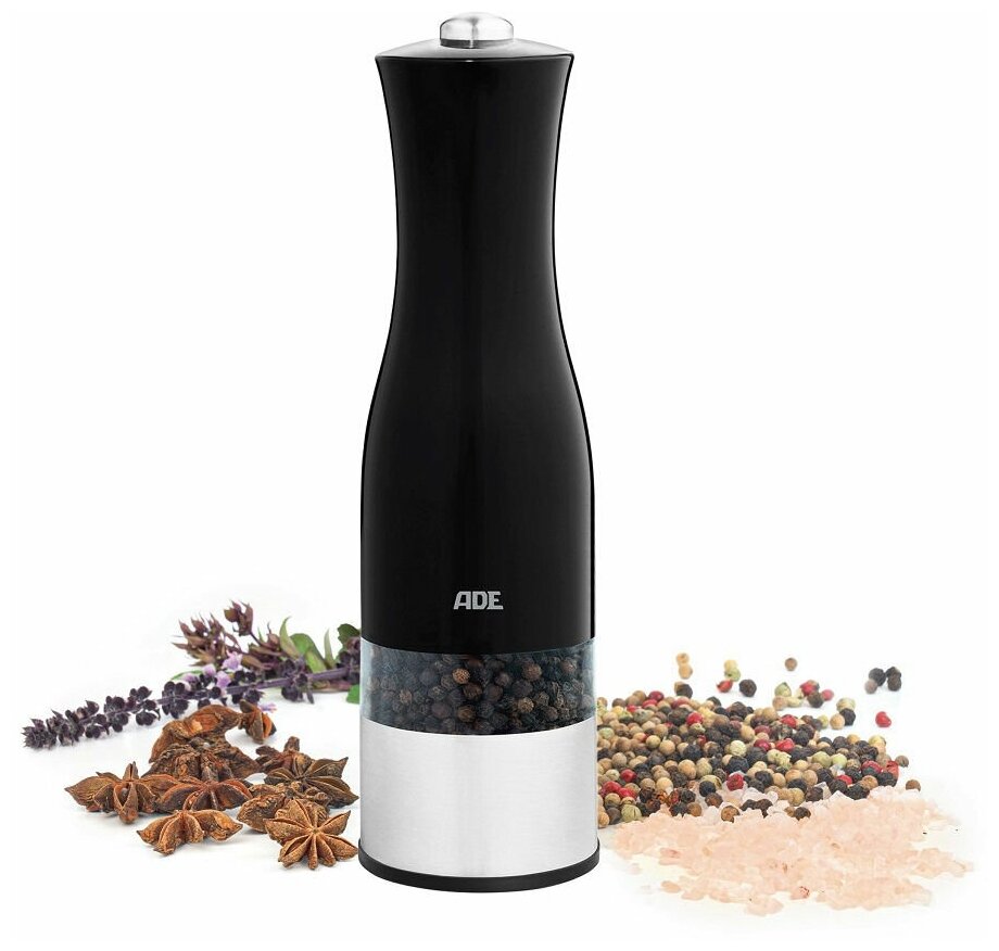 Электрическая мельница для соли и перца ADE создает идеально дозированные и свежемолотые специи и соль одним нажатием кнопки.