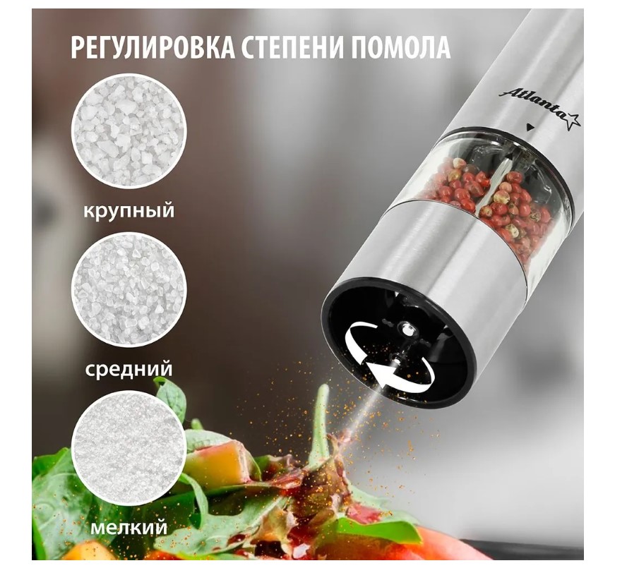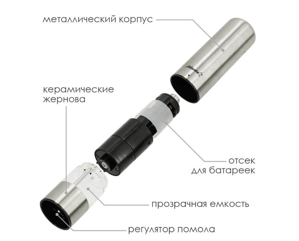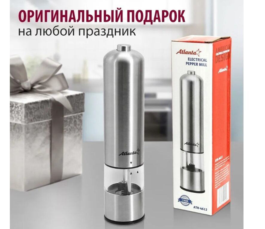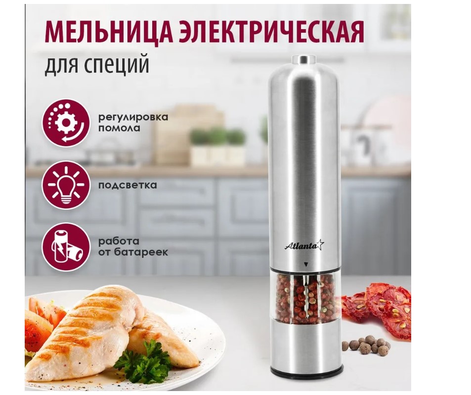 ATH-4612 (gray) Мельница электрическая для специй Atlanta, работа от 4хАА батареек. Долговечный керамический механизм, корпус из высококачественной нержавеющей стали. Регулировка степени помола. Стильный минималистичный дизайн.