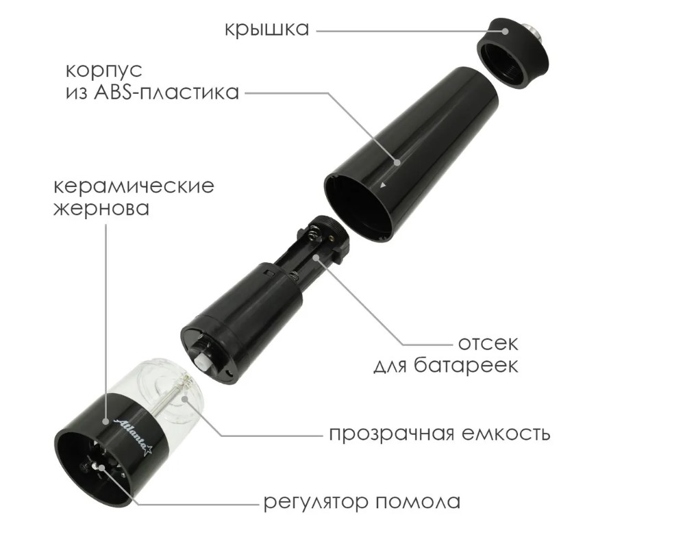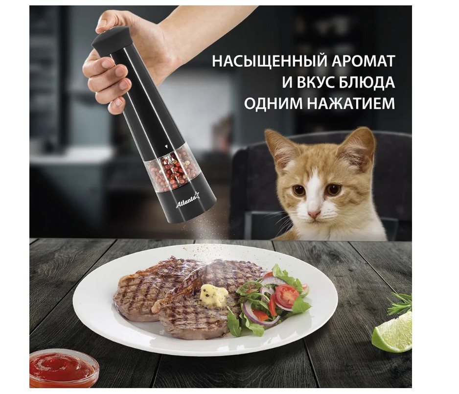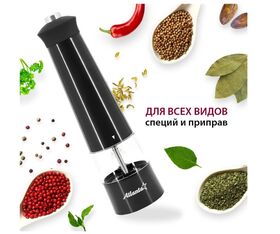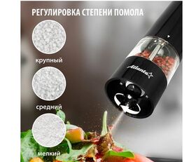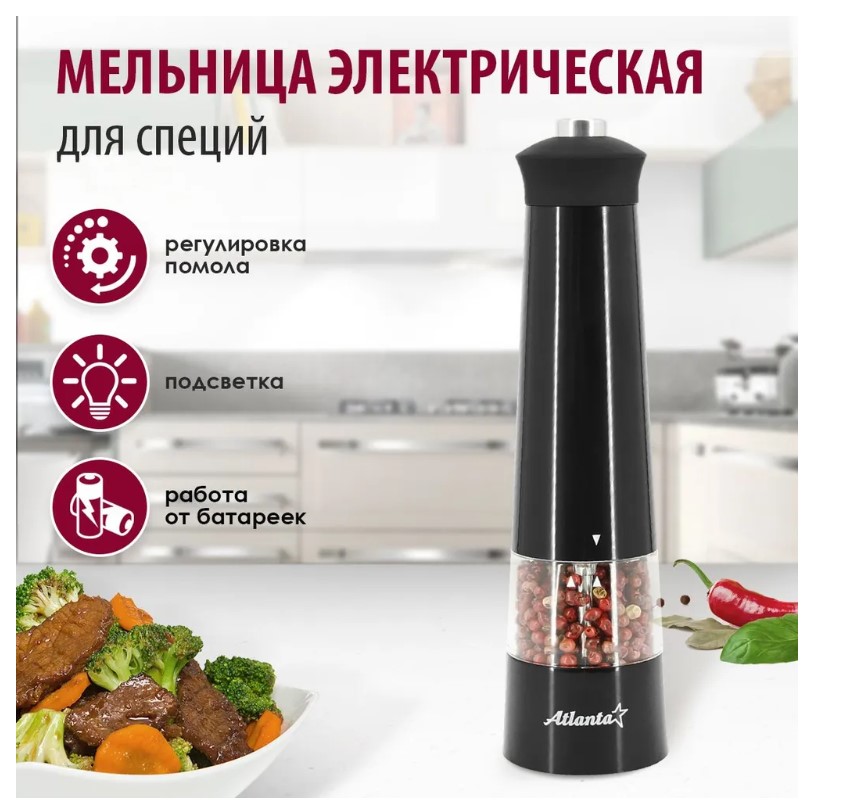 ATH-4614 (black) Мельница электрическая для специй Atlanta станет полезным и стильным аксессуаром на вашей кухне. Буквально за несколько секунд, без каких-либо усилий вы сможете перемолоть перец, крупную соль и другие специи. Благодаря свежим специям каждое блюдо, которое вы готовите, наполнится своим неповторимым, насыщенным вкусом и ароматом. Внутри перцемолки установлен надежный керамический механизм, корпус выполнен из прочного ABS-пластика, установлена регулировка степени помола. Готовьте с электромельницей Atlanta и удивляйте своими кулинарными шедеврами родных и близких.