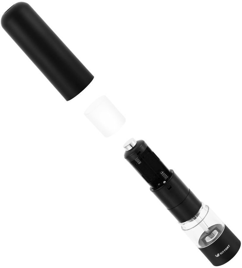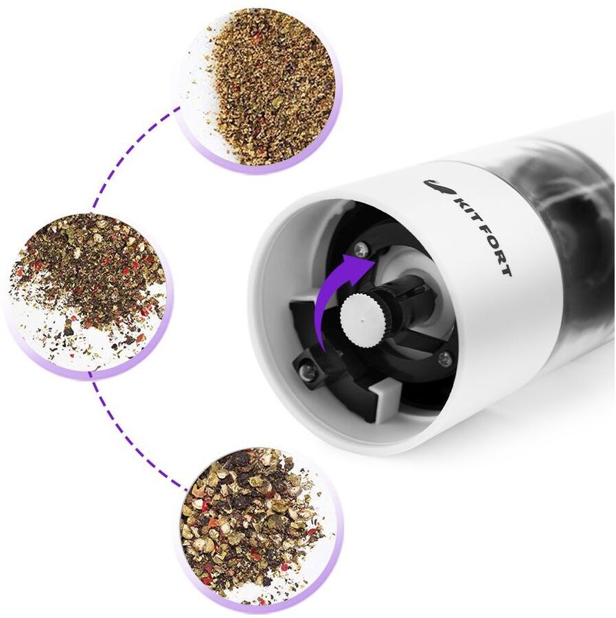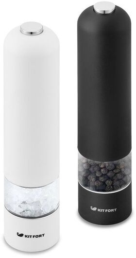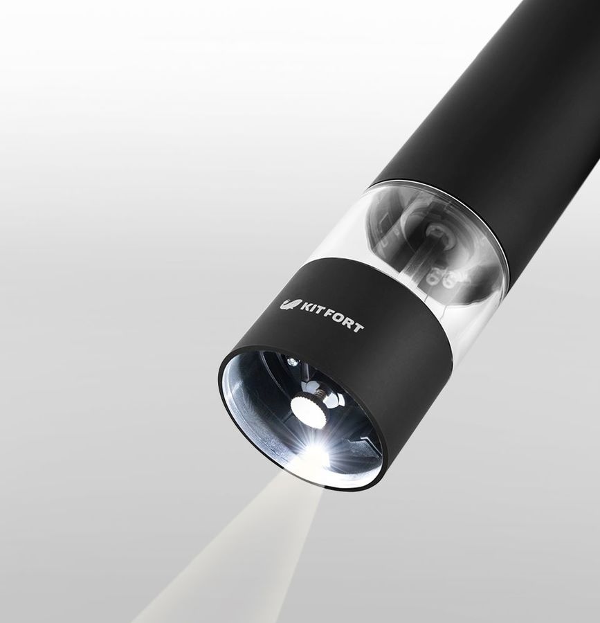 Kitfort KT-2027 измельчает перец-горошек, соль и другие специи. Нет нужды молоть специи впрок. Мельница одновременно мелет и дозирует. Поместите её над блюдом и просто нажмите кнопку.