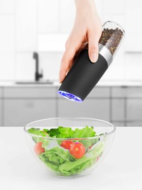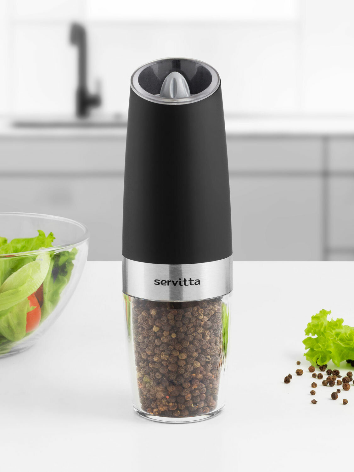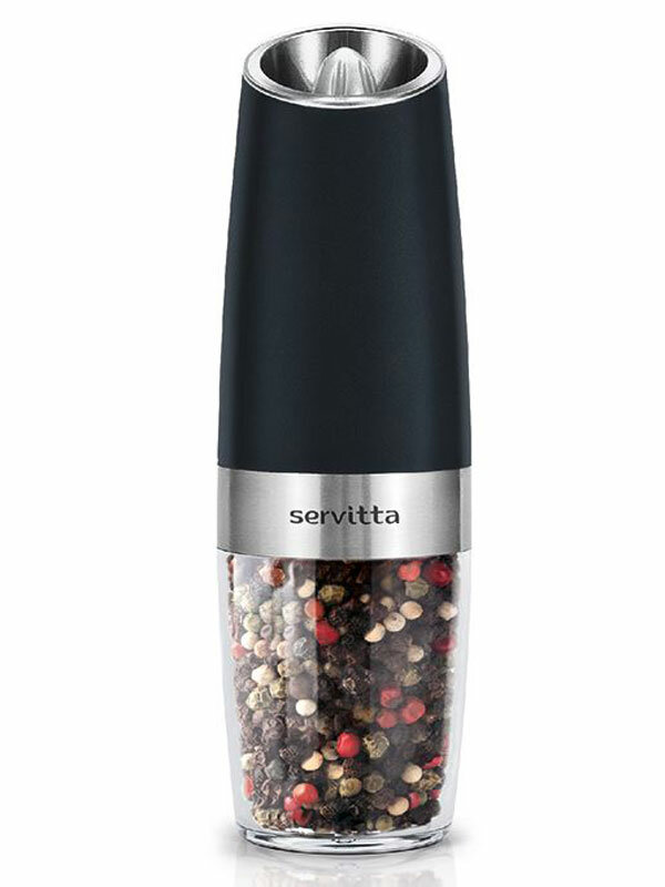 Электрическая мельница для специй, морской соли, перца и различных трав снабжена регулировкой помола (крупный, средний и мелкий помол) и подсветкой для освещения приправляемых блюд.
