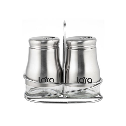 Набор для специй LARA в современном дизайне – это практичный аксессуар для ежедневной сервировки стола. В комплект входит устойчивая проволочная подставка из экологичной высококачественной нержавеющей стали с матовой полировкой. Конструкция с удобным кронштейном для переноски и двумя отделениями для хранения емкостей для специй. Солонка и перечница выполнены из прозрачного стекла. Баночки вставлены в корпус из нержавейки, где открыта нижняя часть для легкого контроля уровня наполнения. Чтобы специи не выдыхались и не отсыревали, отверстия на съемных винтовых крышках можно закрыть оборудованной створкой. Можно мыть в посудомоечной машине.