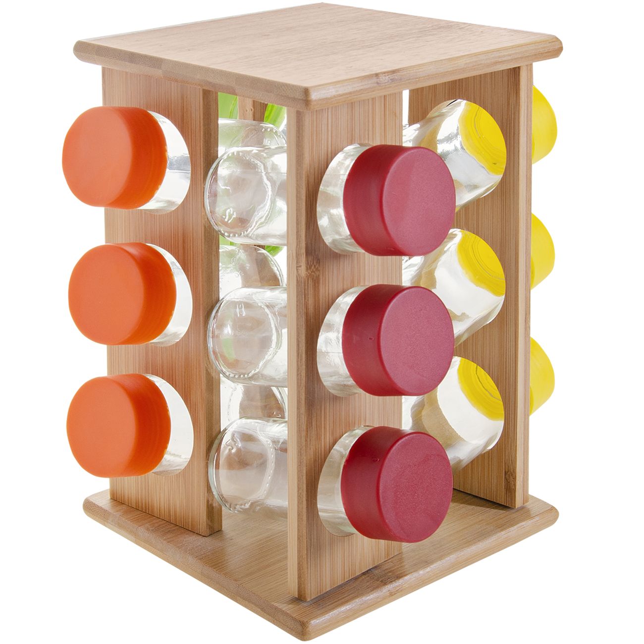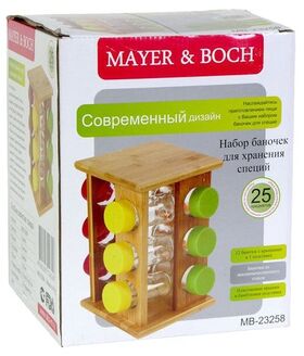 Набор включает в себя несколько баночек для специй, расположенных на вращающейся бамбуковой подставке, благодаря чему ёмкости не потеряются и всегда будут у вас под рукой. Баночки имеют одинаковый размер, плотно закрывающиеся крышки. Изделия выполнены из высококачественного стекла.