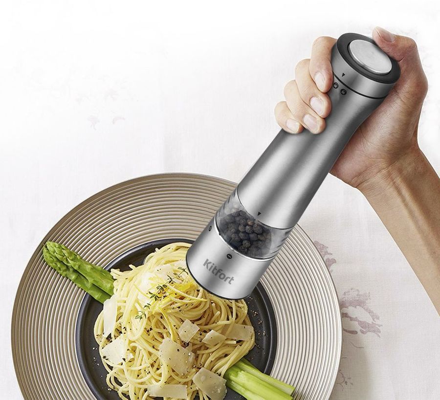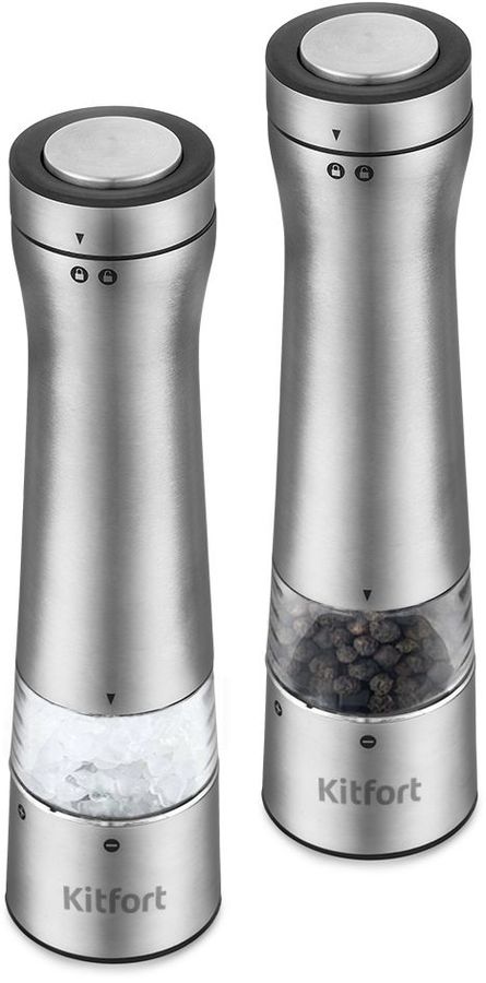 Набор мельниц Kitfort KT-2029 измельчает перец-горошек, соль и другие специи. Нет нужды молоть специи впрок. Мельница одновременно мелет и дозирует. Поместите её над блюдом и просто нажмите кнопку.