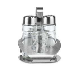 Набор для специй LARA – это практичный и многофункциональный аксессуар для сервировки стола. В комплект входит устойчивая подставка из экологичной высококачественной нержавеющей стали с сатинированной отделкой. Конструкция с удобным кронштейном для переноски, вместительным отсеком для салфеток и отделениями для хранения солонки, перечницы и емкости для зубочисток. Каждая из них выполнена из толстого прозрачного стекла. Съемные крышки с отверстиями изготовлены из нержавейки с зеркальной полировкой. Возможно мытье в посудомоечной машине.