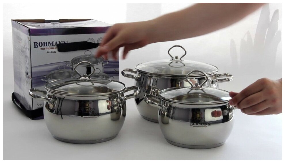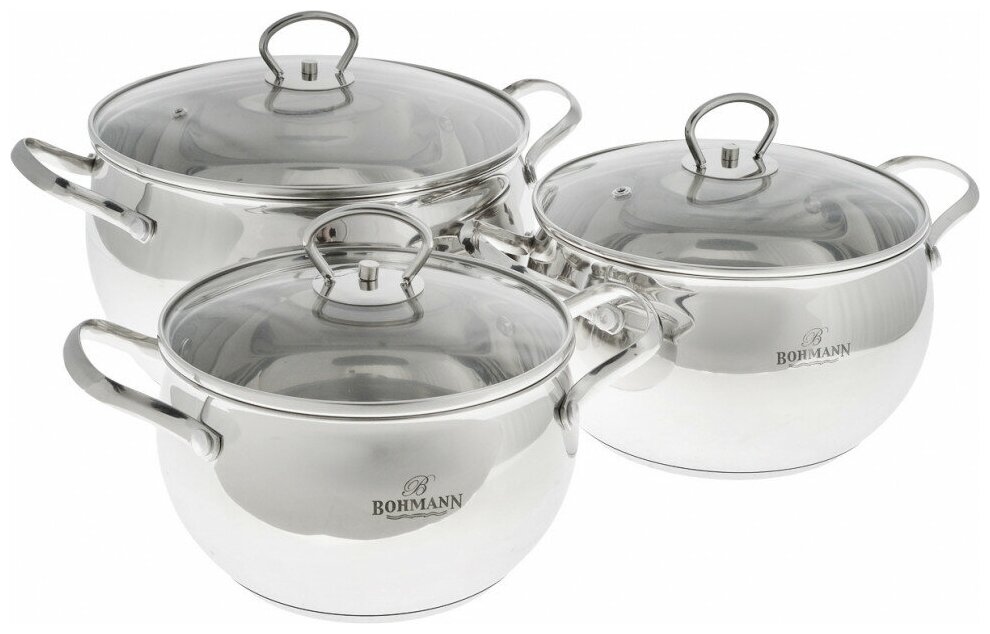 Состав - стекло, нержавеющая сталь Набор кастрюль Bohmann (Бохманн) BH-0602 подходит для электрической, стеклокерамической, газовой, галогеновой, индукционной плиты.