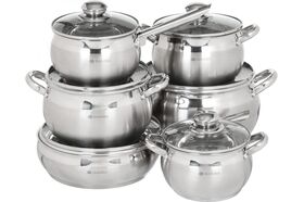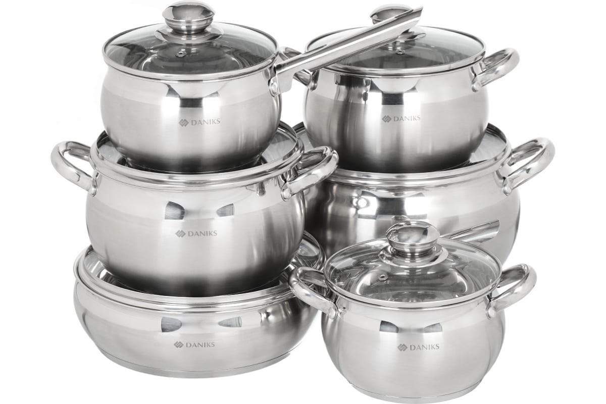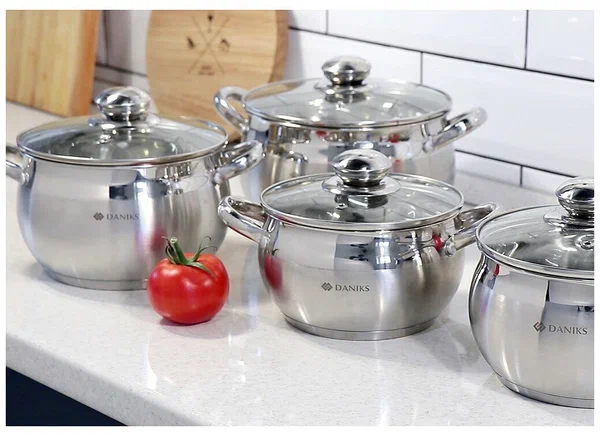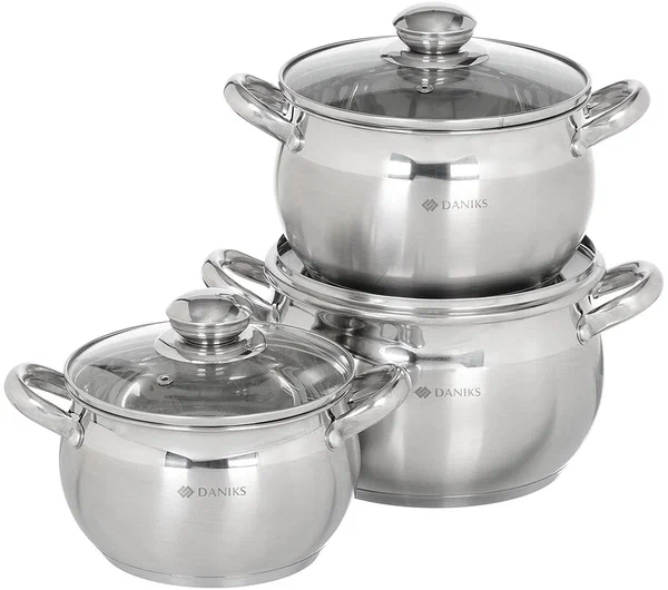 ковш 1.9 л (с крышкой), кастрюли 1.9, 2.9, 3.9, 6.5 л (с крышками), сковорода 24 см (с крышкой)