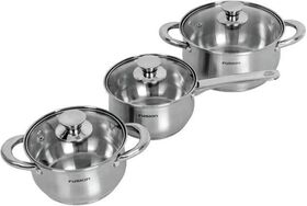 Набор посуды из 6 предметов для самого необходимого: Ковш с крышкой 1,7 л, Кастрюля с крышкой 1,7 л, Кастрюля с крышкой 3,2 л. Высококачественная нержавеющая сталь. Термораспределительное дно. Равномерный нагрев и удержание тепла. Толщина капсулированного дна 4,5мм. Подходит для всех типов плит, в том числе для индукции Крышка из закаленного стекла с отверстием для выпуска пара. Корпус цилиндрической формы. Удобные стальные ручки. Можно мыть в посудомоечной машине.