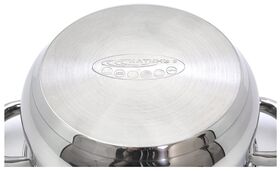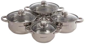 диаметр кастрюль: 16 см, 18 см, 20 см, 22 см; многослойное капсулированное дно; материал крышек: стекло; крышки оснащены пароотводной системой; материал ручек: сталь; ручки прикреплены по технологии клепочной фиксации