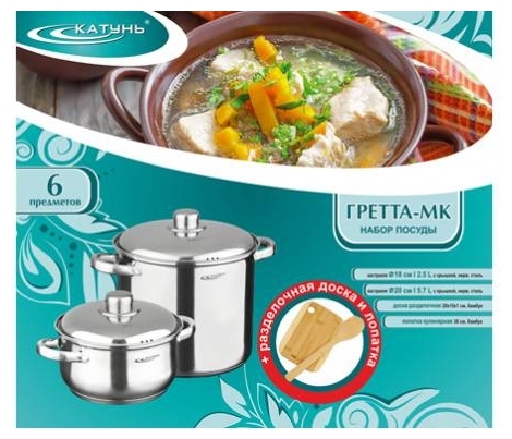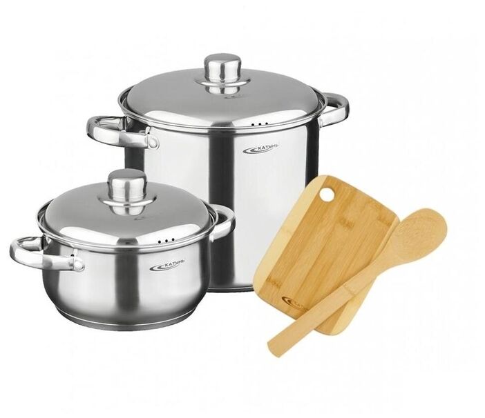 - 2 кастрюли: 2.5 л, 5.7 л; крышка (2 шт.); разделочная доска, лопатка