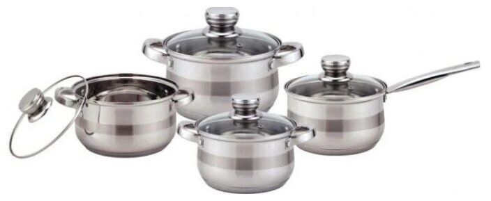 - материал крышек: стекло; материал ручек: сталь; многослойное дно; диаметр кастрюль: 16 см, 18 см, 20 см; диаметр ковша: 16 см