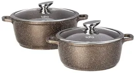 материал крышек: стекло, сталь; материал ручек: алюминий; многослойное дно; кастрюли: 22х10 см, 26х11.5 см
