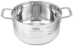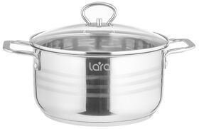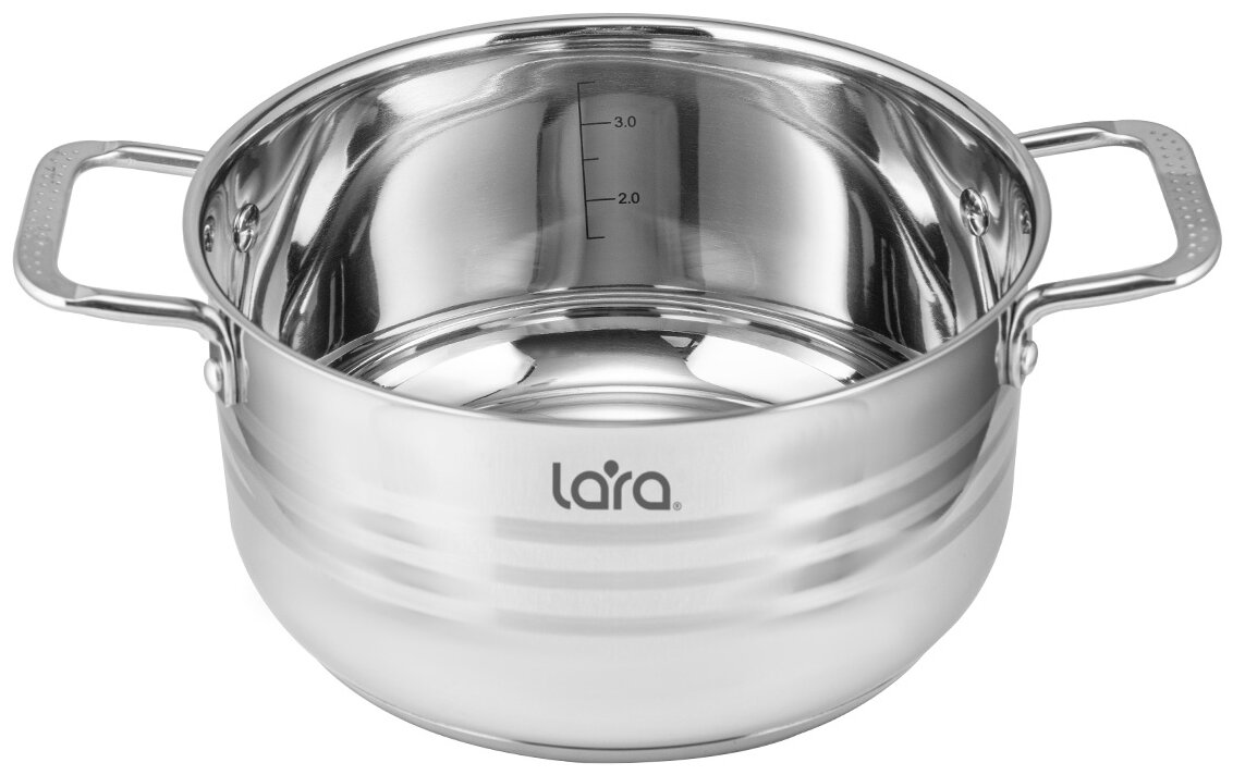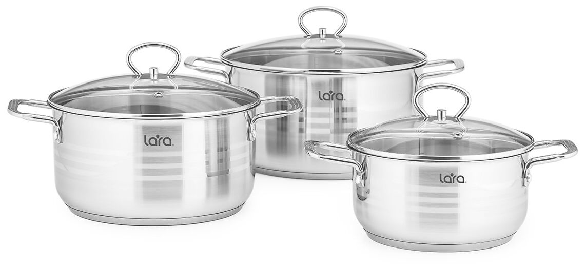 стеклянные крышки, стальные полые ручки на заклёпках, многослойное дно, мерная шкала, диаметр/высота кастрюль: 16см/9см, 20см/10см, 24см/12.5см, зеркальная полировка, нержавеющая сталь AISI 201, крышки с паровыпуском