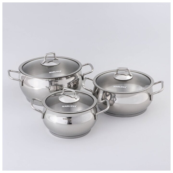 материал крышек: стекло, сталь; материал ручек: сталь; многослойное дно; диаметр кастрюль: 16 см, 20 см, 22 см