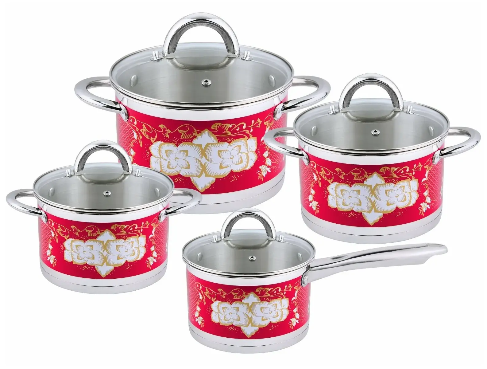 Материал нержавеющая сталь, толщина стенок 0,5мм. 5- слойное капсульное энергосберегающее дно служит для равномерного распределения тепла по всей площади посуды. Подходит для всех типов нагревательных поверхностей, включая индукционные. Удобные не нагревающиеся ручки существенно облегчают процесс приготовления блюд. На внутренних стенках посуды нанесена маркировка литража. Стеклянные крышки с отверстием для выпуска пара. Стильный жаростойкий рисунок на внешних стенках посуды. Диаметры кастрюль: 18 см, 20 см, 24 см и соусник 16 см.