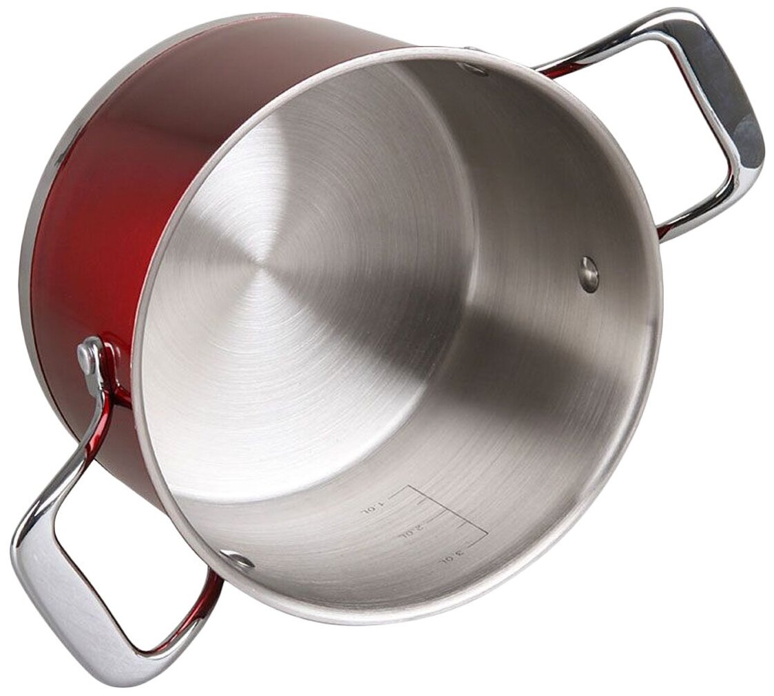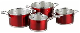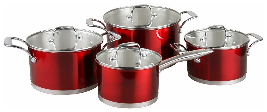 Состав набора кастрюли- 2 штуки, ковш- 1 штука, крышка- 4 штуки